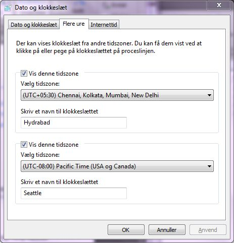 Har du tilføjet flere tidszoner vises et ur for hver tidszone. På samme måde vises tiden i for alle de tidszoner, du har tilføjet, bare du holder musemarkøren hen over uret på Proceslinjen.