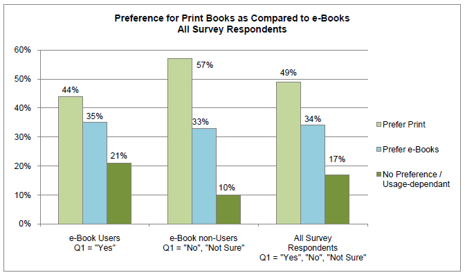 Faktisk svarer 49 procent, at de fortsat foretrækker print-bøger, mens kun 34 procent foretrækker e-bøger. Resten har ingen præference.