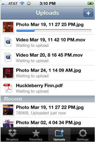 Dropbox har lavet en iPhone-app, som indeholder en funktion, der er fantastisk til fotografer. Start app'en og gå ind i fanebladet Uploads, hvor du kan uploade flere fotos på én gang direkte fra dit kamera til enhver mappe i din Dropbox-konto.