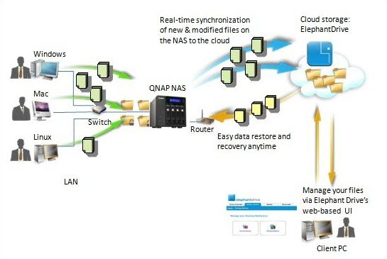 Du lejer altså lagerplads på en udbyders server. Hvis du eksempelvis har anskaffet en NAS-server fra Qnap, kan du benytte tjenesterne ElephantDrive og Amazon S3 (Simple Storage Service), som NAS-serveren kan samarbejde med på smukkeste vis. NAS-servere fra Synology understøtter ligeledes Amazon S3.