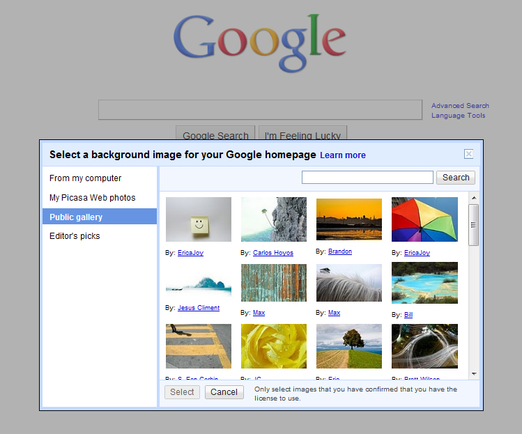 Nu har du mulighed for at vælge, hvilket billeder der skal pryde Google. Det er muligt at vælge et billede fra sin pc, sit eget Picasa Web Album eller et offentligt galleri på Picasa. Der er oceaner af flotte fotos at vælge imellem, og en søgefunktion gør det nemt at sortere i billederne. Klik for større foto.