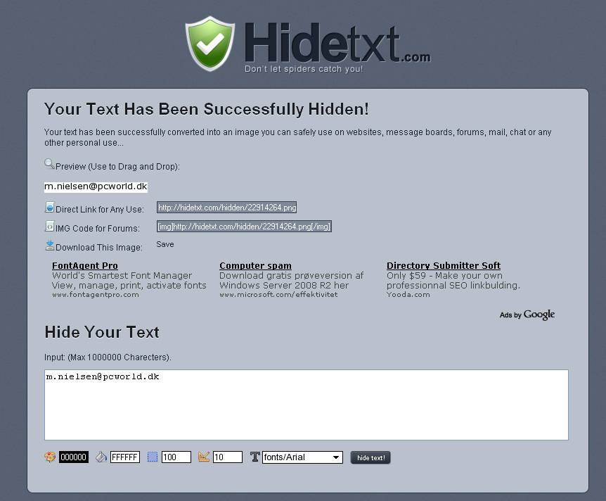 Her indtaster du eksempelvis din mailadresse, hvorefter websiden tryller adressen om til et billede. Det indeholder fortsat din mailadresse, som er synlig, men da søgerobotterne ikke kan afkode fotoet, vil din mailadresse ikke blive opsnappet. Dermed er der mindre sandsynlighed for, at du får din indbakke bombet med tilbud om penisforlængelse, Viagra og Rolex-ure.