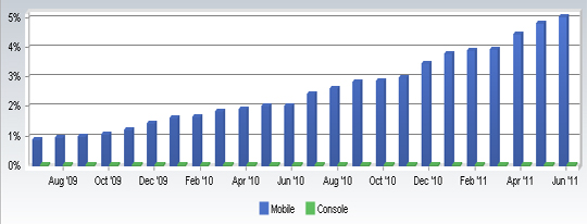 Det ses også i Net Applications statistik-barometer, hvor smartphones og tablet-pc'er samlet set vurderes til at stå for fem procent af net-trafikken.