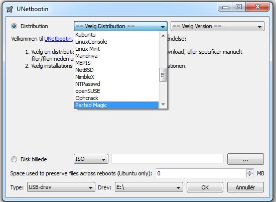 Hvis du ønsker at lægge Parted Magic på en USB-nøgle, anbefaler vi at benytte UNetbootin, som ikke kræver, at du henter Parted Magic på forhånd. Du skal blot vælge Parted Magic fra Linux-distributionslisten og vælge USB-nøglen som destinationsdrev. En hukommelsesnøgle på 512 megabyte rækker fint.