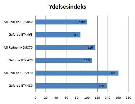 Ydelsesmæssigt har GTX 465 hårde odds. Isoleret er det bestemt ikke nogen ueffen ydelse, det flotte kort fra Gigabyte præsterer, men Radeon HD 5850 overtrumfer Geforce-kortet, især når det gælder pris/ydelse, men også i forhold til strømforbrug, som vist ovenfor. Vores ydelsesindeks giver således Geforce-kortet 87 procentpoint, mens ATI-alternativet høster 100.