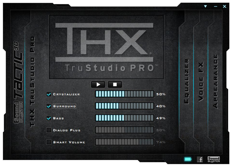 Softwaren, der skal downloades på Creatives Sound Blaster-webside, er nødvendig, hvis du vil udnytte de mange softwarebaserede THX-effekter såsom virtuel surround og crystalizer. Sidstnævnte kan give et løft af lydkvaliteten, hvilket især giver mening, hvis du lytter til hårdere komprimeret musik eller ser film, hvor lydsporet ligeledes har været udsat for en ubarmhjertig komprimering.