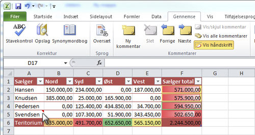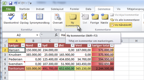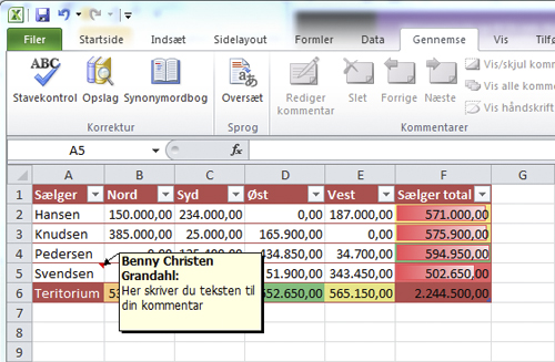 Er der en lille, rød trekant i det øverste højre hjørne af en celle, er der nogen, der har indsat en kommentar i cellen. Hold musemarkøren hen over den røde trekant, så åbnes kommentaren som et skærmtip.