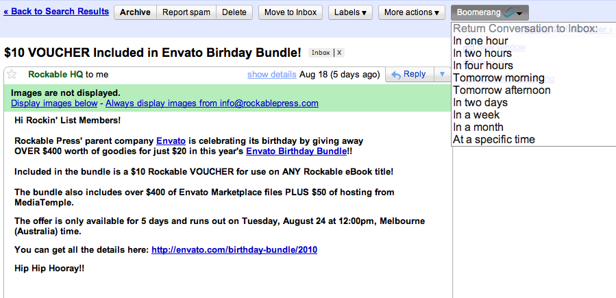Hvis du er af den glemsomme type, kan du desuden bruge Boomerang til at huske dig på at svare på en mail. Du kan indstille Boomerang til at gensende en mail til dig på et tidspunkt, hvor du har bedre tid til at tage dig af den.