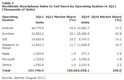 Nokia offentliggjorde eksempelvis, at selskabet i andet kvartal solgte 16,7 millioner smartphones, mens der ifølge Gartner blev solgt næsten 24 millioner mobiler med Nokias Symbian-platform i andet kvartal.