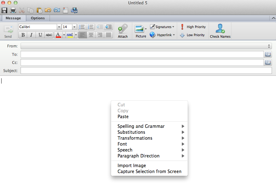 Har du Outlook til Mac, klikker du i mailens tekst-felt, mens du holder ctrl nede. Herefter vælger du "capture selection from screen".