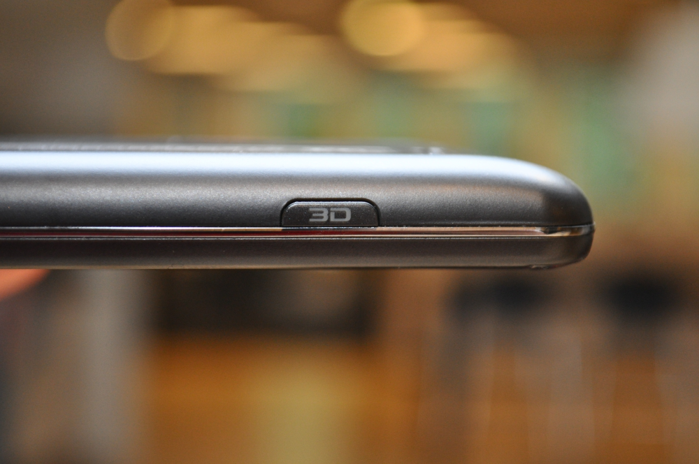 Et kig på mobilen afslører, at denne telefon som noget unikt kan vise 3D. På siden af Optimus 3D'en er der en 3D-knap, hvor du slår 3D til og fra, alt efter om du vil have 3D-effekter slået til i spil, på fotos og i videoer.