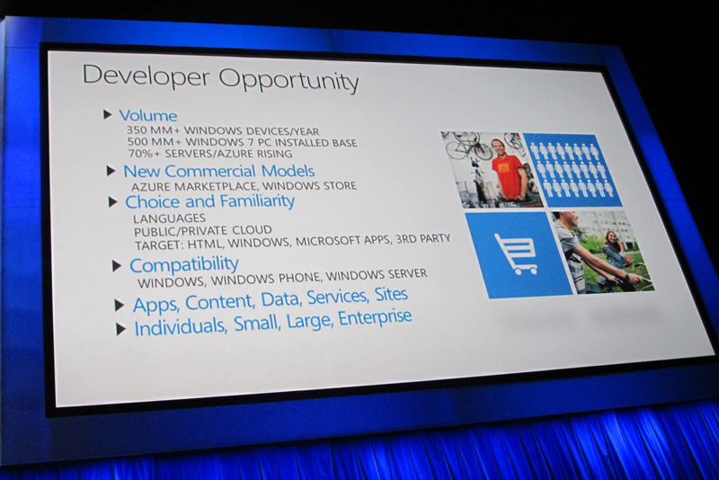 Eller som Steve Ballmer sagde under sin keynote onsdag: "Vi vil have dem alle sammen, alle udviklerne: De 14-årige, de kæmpe firmaer, hardwareudviklerne, folk der koder lidt om aftenen efter arbejde og alle de andre, der koder."