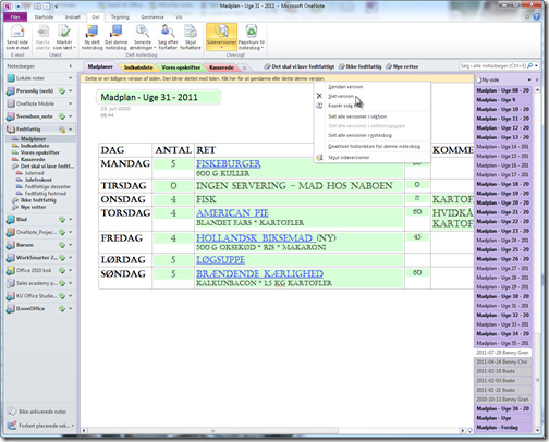 Det gør du ved at klikke på Del-fanen | Sideversioner. Så åbnes de ekstra versioner af siderne som nogle grå faner i rækken af sidefaner til højre i notesbogen og du kan nu klikke på hver enkelt sideversion og sammenligne den med den senest synkroniserede version af siden, der vil have samme fanefarve som de andre sidefaner i sektionen.