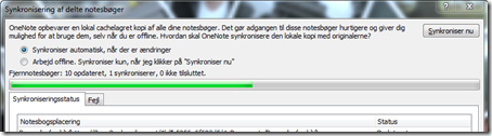 Nogle gange skyldes fejlen, at der midlertidigt ikke er forbindelse til notesbogens placering i skyen. Kan du ikke fjerne fejlen på anden måde, så prøv at markere notesbogen i listen på Synkroniseringstatus-fanen i Synkronisering af delte notesbøger-dialogboksen og klik på Synkroniser den valgte notesbog-knappen nederst i dialogboksen.