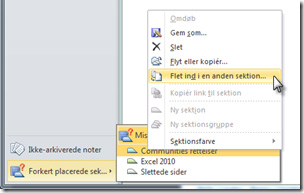 Du kan så flytte sektionen til en anden notesbog eller tilbage i den notesbog, den er blevet slettet fra ved at højreklikke på sektionen og vælge Flyt eller kopier eller Flet ind i en anden sektion i genvejsmenuen. Du kan også vælge at slette den ved at klikke på Slet.