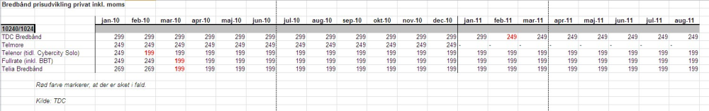 Men TDC fremlægger nu en oversigt - et dataark - over udviklingen i danske bredbåndspriser de seneste år - måned for måned.