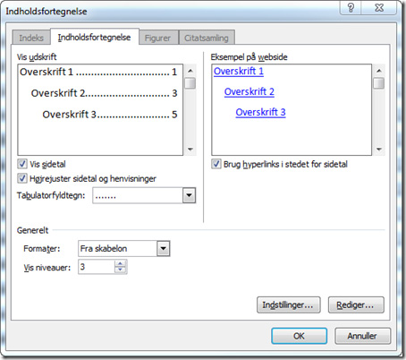 For når du skal generere indholdsfortegnelsen, vælger du, hvilke overskriftstypografier der skal medtages i indholdsfortegnelsen. Så genereres indholdsfortegnelsen helt automatisk med rigtige sidenumre og det hele.
