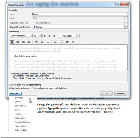 Anvender du standardtypografierne i Word, er det nemt efterfølgende at ændre udseende på teksten i hele dokumentet blot ved at ændre indstillingen for den enkelte typografi.