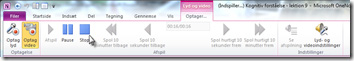 Klik på Indsæt-fanen og derefter på Optag lyd- eller Optag video-knappen i Optagelse-gruppen. Så snart du har klikket på knappen, startes optagelsen, og Lyd og video-værktøjerne åbnes yderst til højre på Båndet. Samtidig indsættes et lyd- eller video-ikon på den side, du har åben i OneNote.