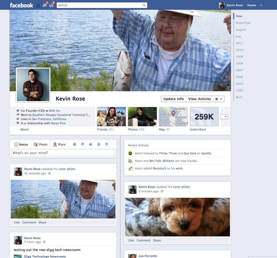 En af de tydeligste ændringer bliver Timeline. Tidslinjen ændrer den måde, som brugernes profiler se ud på. Eller som Facebook selv beskriver det: "I dag bliver dine billeder fra din dimissionsfest hurtigt skubbet i baggrunden af opdateringer, hvor du fortæller, hvad du fik til morgenmad".