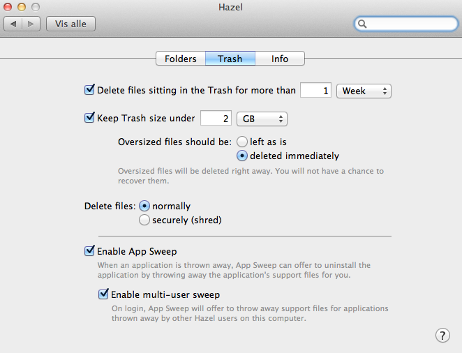 Sletter du manuelt overflødige programmer på din Mac, er det ikke sikkert, at du har fået det hele med. De fleste programmer efterlader nemlig spor i form af filer, der er spredt ud over flere steder på din harddisk. Men Hazel har en såkaldt App Sweep-funktion, som du finder under trash-menupunktet. Den sørger for, at det hele bliver slettet, hver gang du smider et program i papirkurven.