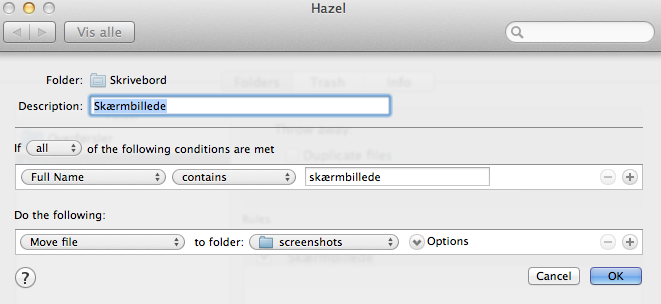 Den første linje fortæller, at filteret skal gælde for alle filer på skrivebordet, hvis navn (full name) indeholder (contains) ordet "skærmbillede".