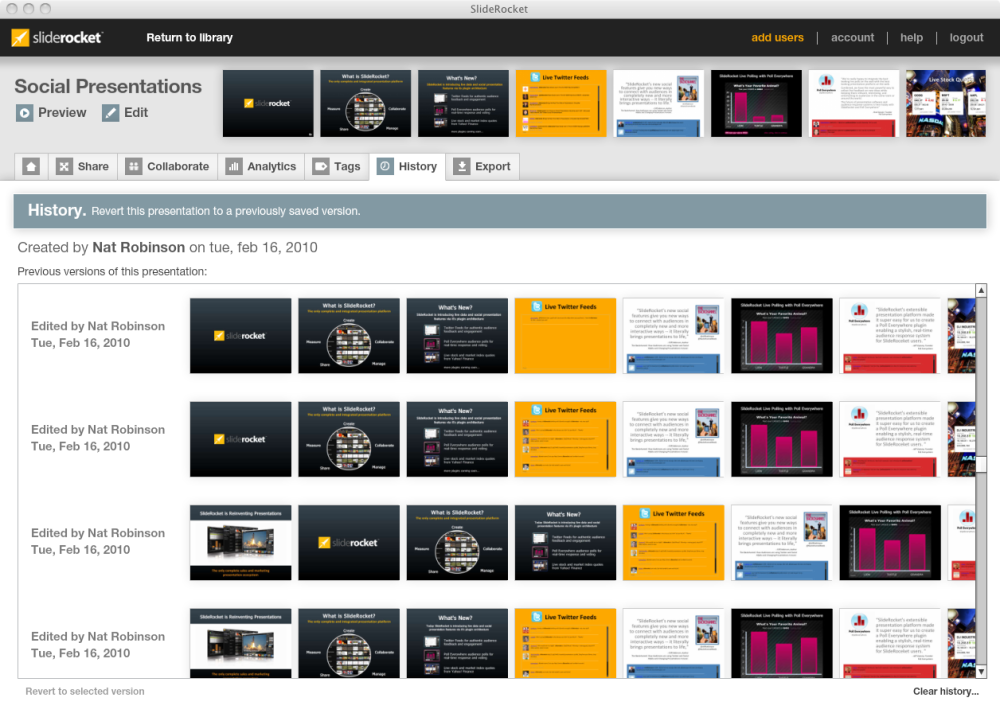 I stedet kan du få adgang til præsentationen hvor som helst, hvis du blot logger ind på SlideRockets hjemmeside. SlideRocket tilbyder dog også, at du kan downloade et stykke software, der gør det muligt at skyde din præsentationer af uden en internet-forbindelse.