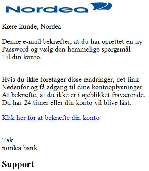 Nordea har på det seneste været udsat for mange forskelligartede phishingforsøg og -mails. De fleste er rent grafisk meget lig Nordeas grafik, men tekstens kvalitet har været svingende mellem kluntet maskinoversættelse og ganske fornuftige formuleringer.
