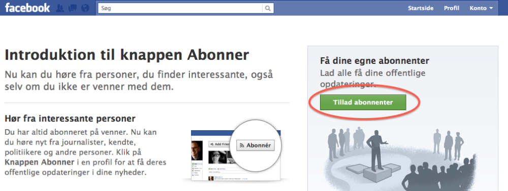 Vil du gerne have mulighed for at få abonnenter på din Facebook side, slår du det til ved at gå ind på Facebooks abonnement-side, som du finder her.