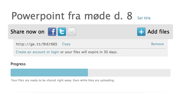Du skal blot gå ind på www.ge.tt og klikke på "select files", og i løbet af få sekunder er du i gang. Når du har valgt dine filer, blive du sendt videre til en ny side, hvor du får et direkte link til filerne.