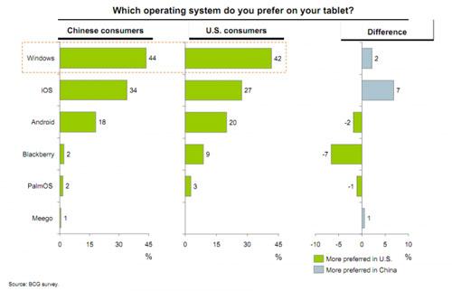 Brugernes mindst ønskede styresystem på tabletten er, ifølge Boston Consulting Group, Android. Kun omkring 20 procent af amerikanerne, og kineserne ønsker Googles variant på brættet.