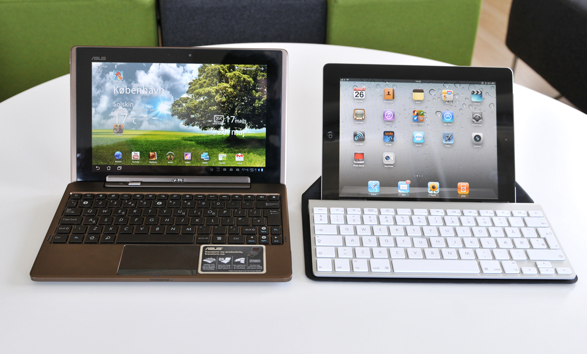 En Asus- og en Apple-tablet side som side - begge koblet sammen med et eksternt tastatur. Foto: Mikkel William Nielsen.