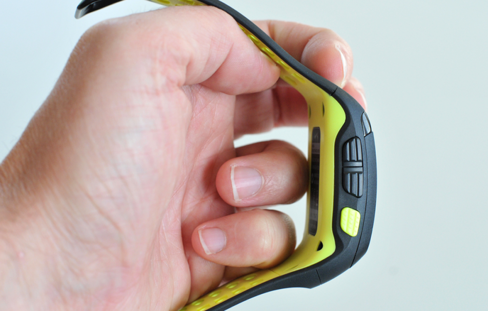 To bruges til at navigere op og ned på skærmen, og en neonfarvet knap bruges til at vælge i menuen og sætte løbeture i gang. Det er både en fordel og ulempe for uret, at det er så simpelt.