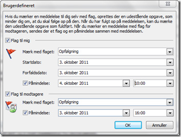 På samme måde kan du sætte et flag til modtagerne af mailen i den nederste del af Brugerdefineret-dialogboksen. Igen skriver du en beskrivende tekst i Mærk med flaget-feltet og vælger et påmindelsestidspunkt i Påmindelse-felterne.