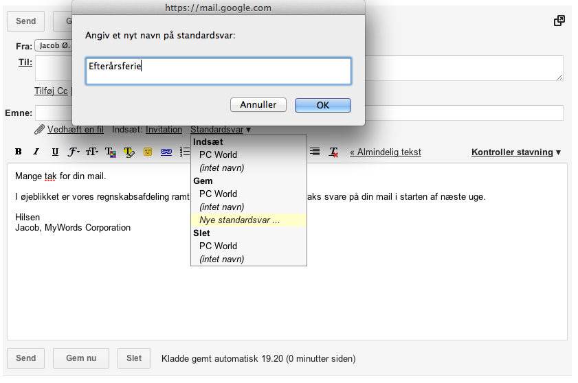 Når du har gjort det, gemmer du den ved at klikke på "Standardsvar", vælge punktet "nye standardsvar" og herefter give dit svar et dækkende navn.