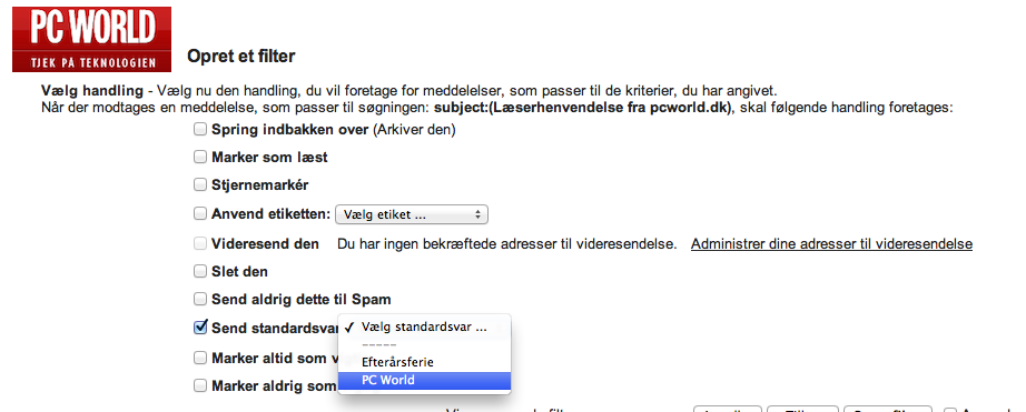 Eksempelvis kunne vi lave et andet filter, der gælder for "læserhenvendelser fra computerworld.dk", og som henviser til et andet standardsvar.