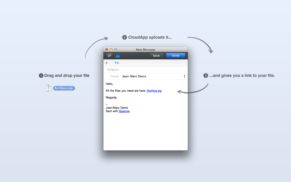 Når det sker, bliver filen ikke vedhæftet, men i stedet uploadet til den Dropbox-lignende tjeneste CloudApp, og der bliver i stedet tilføjet et direkte link til filen.
