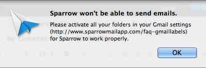 Da vi første gang satte Sparrow op med vores Gmail-konto, fik vi gang på gang en fejlmeddelelse, hvor programmet opfordrede os til at ændre på nogle indstillinger i Gmail -på trods at de var indstillet, nøjagtigt som Sparrow anbefalede det.