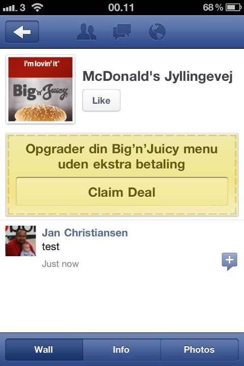 Ifølge det danske Facebook-bureau Komfo er McDonalds og 7 Eleven de eneste forretninger i Danmark, der kan give kontante fordele, når deres kunder "tjekker ind" i deres butikker på Facebook. Hos McDonalds kan man for eksempel opgrade sin menu gratis.