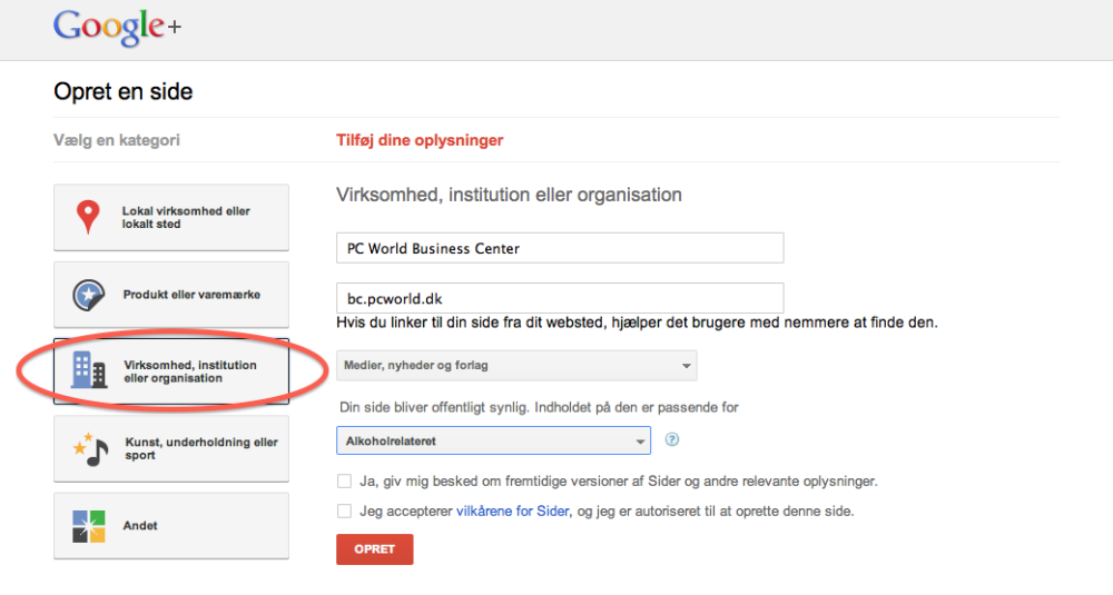 Når du har gjort det, udfylder du felterne med din virksomheds navn, hjemmeside osv.