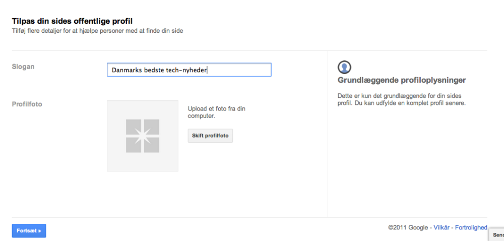 På den næste side skal du beskrive din virksomhed eller jeres nye Google+-side med 10 ord, og herefter skal du vælge et billede.