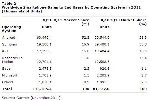 Med Microsofts markedsandel er der langt op til Googles Android, der var installeret på 52,5 procent af alle solgte smartphones i årets tredje kvartal.