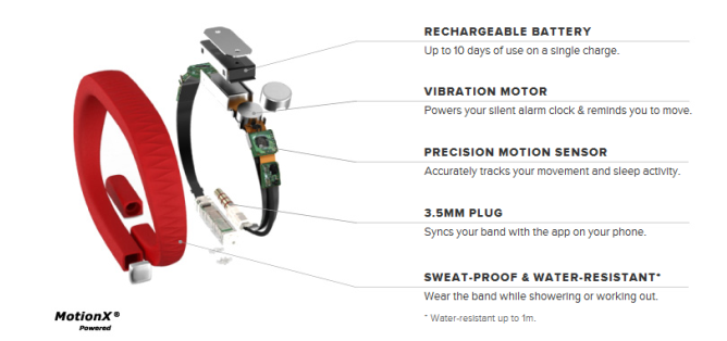 Jawbone har døbt produkt Up, og det består af en iPhone-app og et smart armbånd, der måler dine bevægelser. Armbåndet er vandtæt og har indbygget en bevægelsessensor, en vibrator og et batteri, der kan klare 10 dage på en opladning.