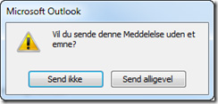 Faktisk er der ikke rigtig nogen undskyldning for at glemme at skrive en tekst i Emne-feltet, for hvis du forsøger at sende en mail uden noget i Emne-feltet spørger Outlook dig, om du nu også virkelig ønsker at sende mailen.