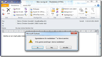 Når du har skrevet teksten, lukker du mailen og klikker på Ja-knappen for at gemme mailen med den nye tekst i emnefeltet.