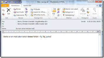 Tippet går i al sin enkelhed ud på, at du selv kan skrive noget tekst i Emne-feltet ved simpelthen at åbne mailen, placere Indsætningspunktet i Emne-feltet på mailen og skrive den beskrivende tekst, afsenderen har "glemt" at skrive.