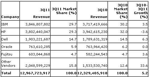 Antallet af servere, der blev sendt afsted fra leverandørerne i tredje kvartal, var 7,2 procent højere end i samme periode sidste år, mens omsætningen steg med 5,2 procent.
