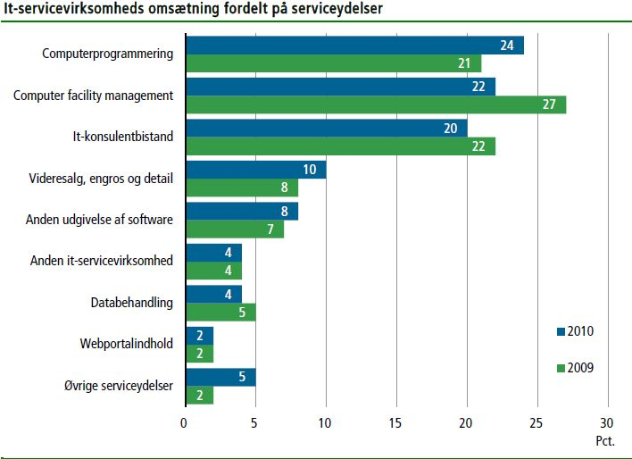 I øvrigt ser overskrifterne fra Danmarks Statistik således ud gennem de seneste fem år: 2006: Computerprogrammering havde størst omsætning. 2007: Computerprogrammering fortsat størst. 2008: Udgivelse af software i fremgang. 2009: It-konsulentbistand nu den største serviceydelse. 2010: Design- og udvikling er største it-serviceydelse.