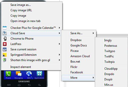 Cloud Save integrerer en lang række cloud-baserede services med din browser, så du har nem og hurtig adgang til dem. Du højreklikker bare på ethvert link eller billede hvor som helst på nettet og finder valgmuligheden "Cloud Save" i kontekstmenuen. Derfra vælger du den service, du anvender, hvorefter din fil gemmes direkte fra nettet på din valgte cloud-service.