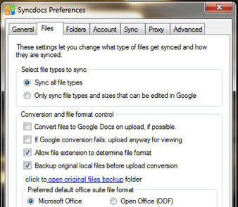 Syncdocs kan synkronisere enhver filtype. Man skal fortælle programmet hvilken mappe, det skal overvåge, hvorefter alt, der bliver tilføjet, fjernet eller ændret, automatisk opdateres i skyen. Syncdocs kan kun sættes til at overvåge en enkelt mappe, men den mappe kan til gengæld indeholde så mange filer og undermapper, som man ønsker. Den eneste begrænsning er din tilgængelige plads i Google Dokumenter. Som standard har man en gigabyte storage til filer, der ikke er i Googles eget dokumentformat og det er muligt at købe ekstra plads.